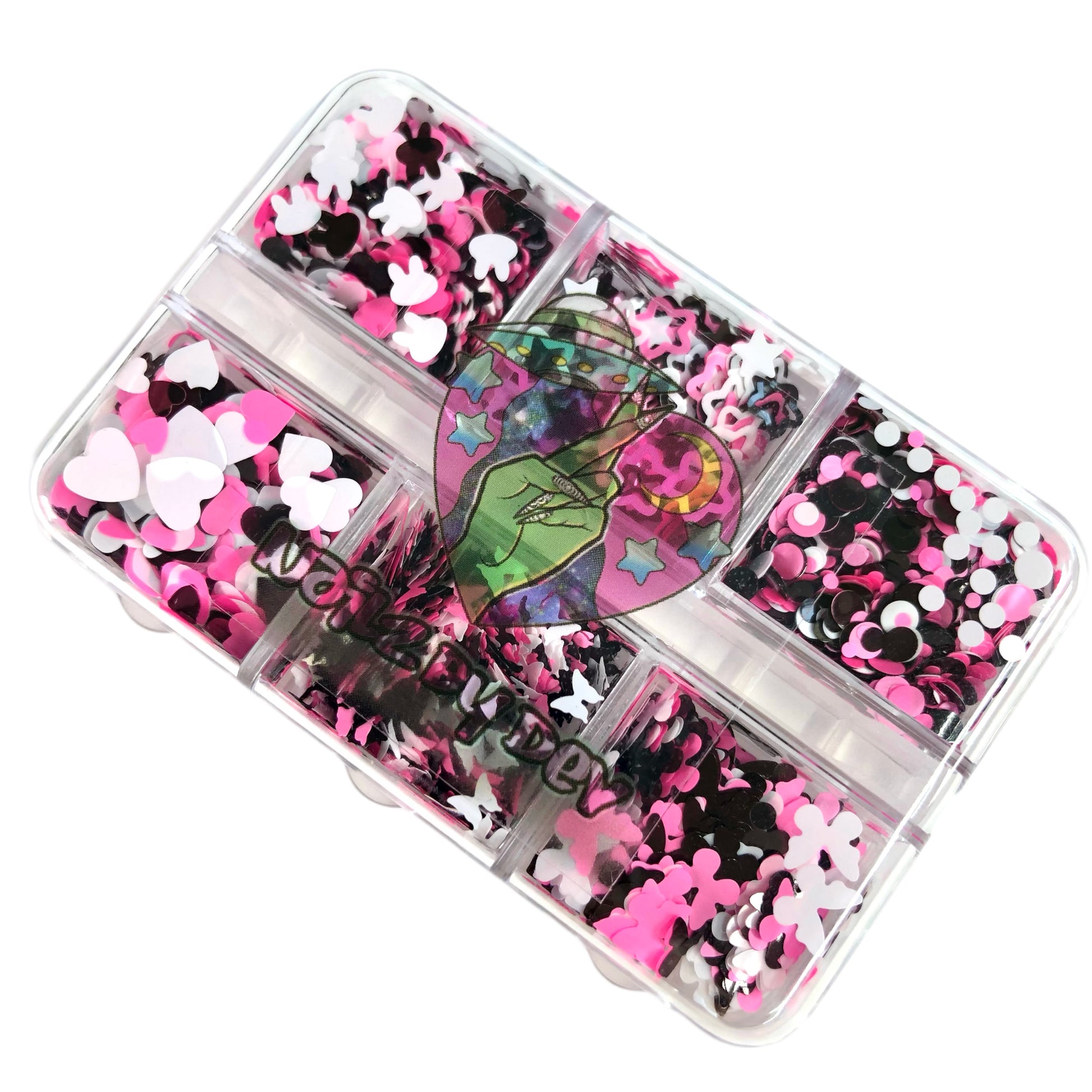 6 different shapes of black, pink, and white glitters — perfect for creating nostalgic Y2K-inspired nail art.