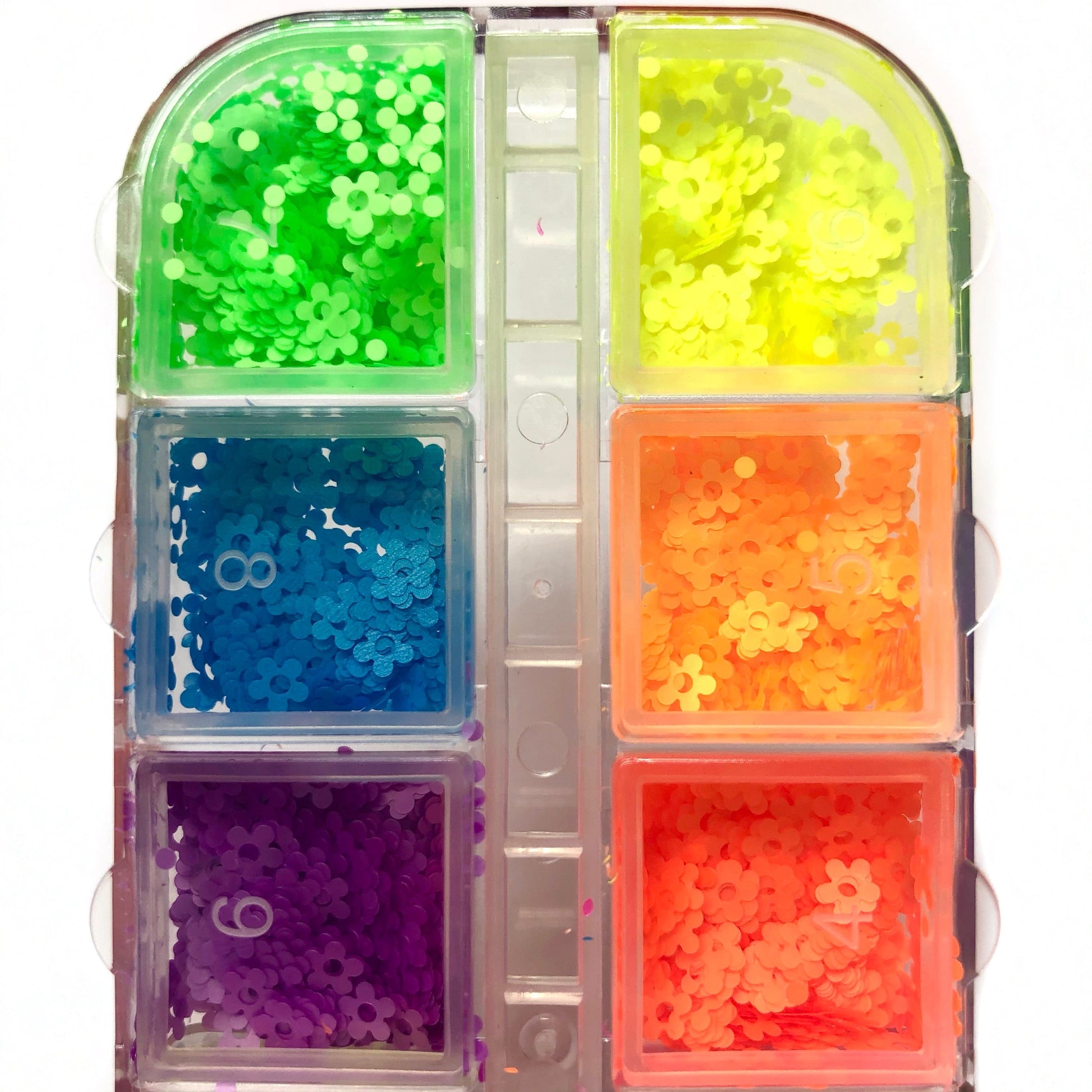12 slots of neon daisy glitters — perfect for bold, playful, and festival-inspired nail designs.