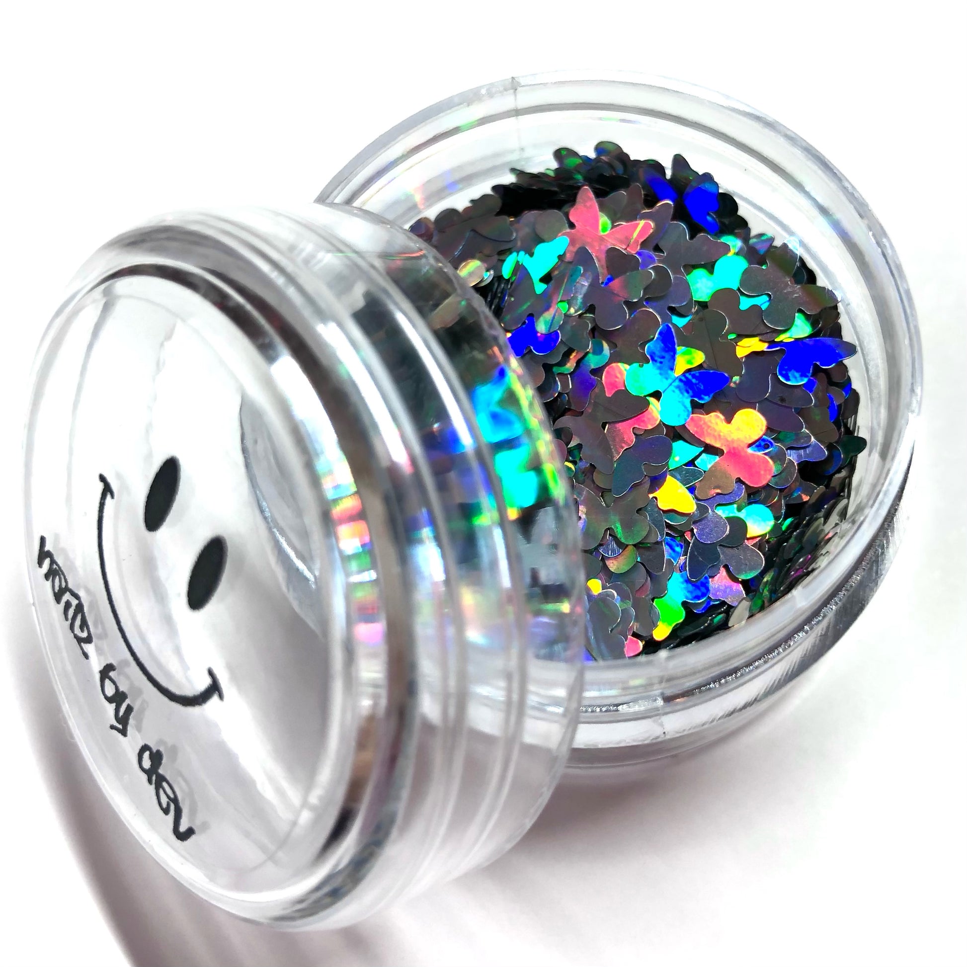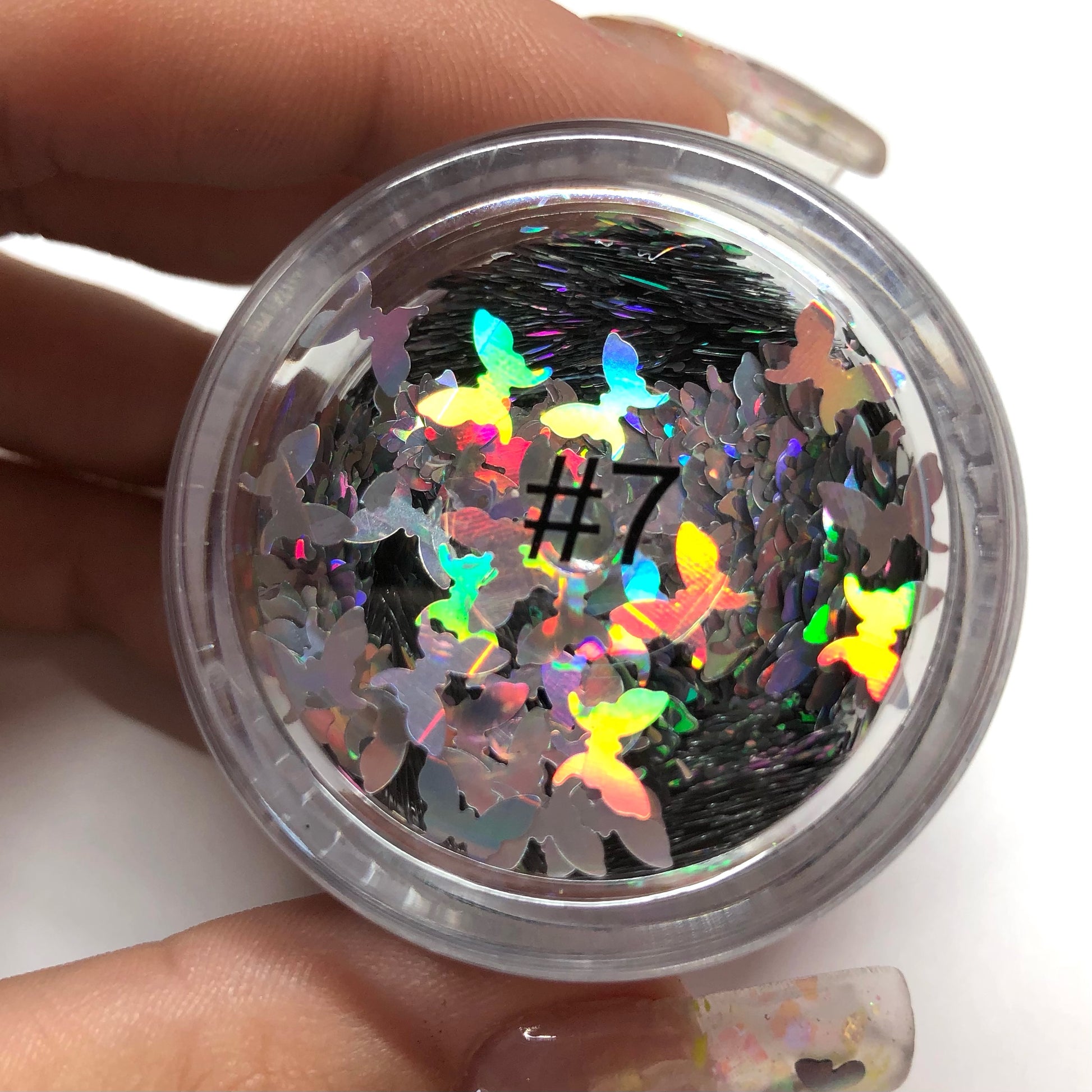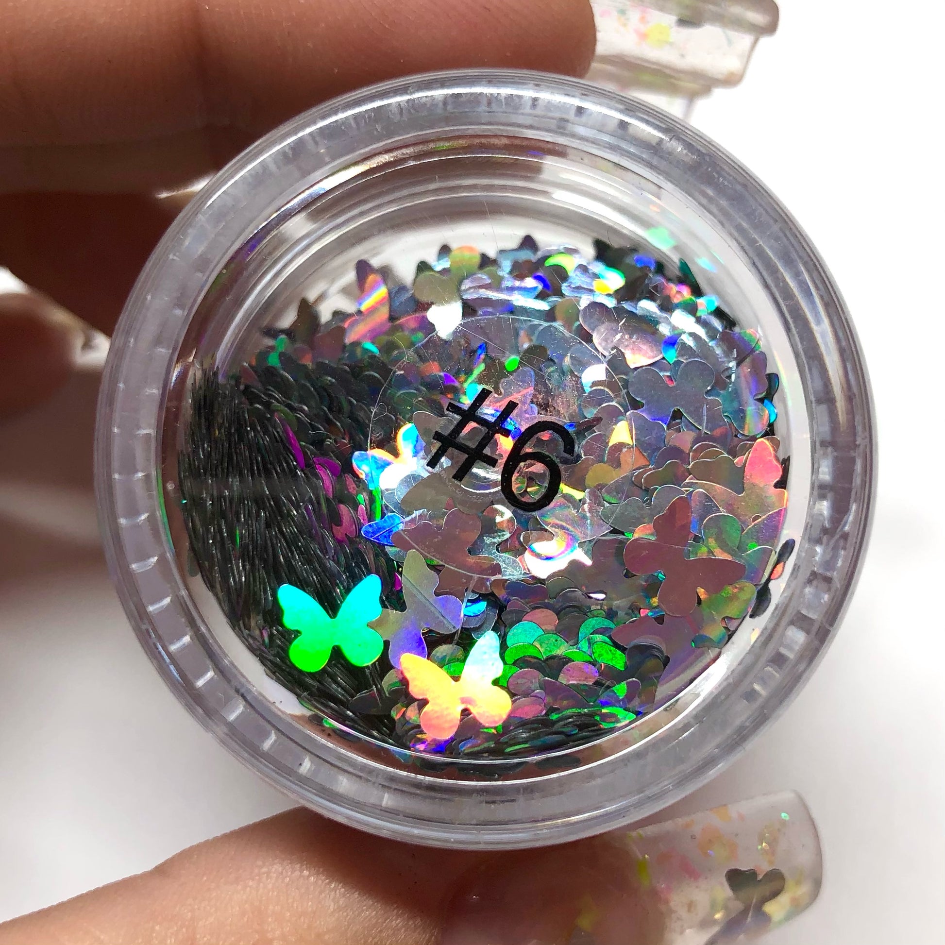 4mm holographic butterfly glitters available in Style 6 and Style 7. Comes in a large jar with 8g of product — perfect for nail art and encapsulation designs.