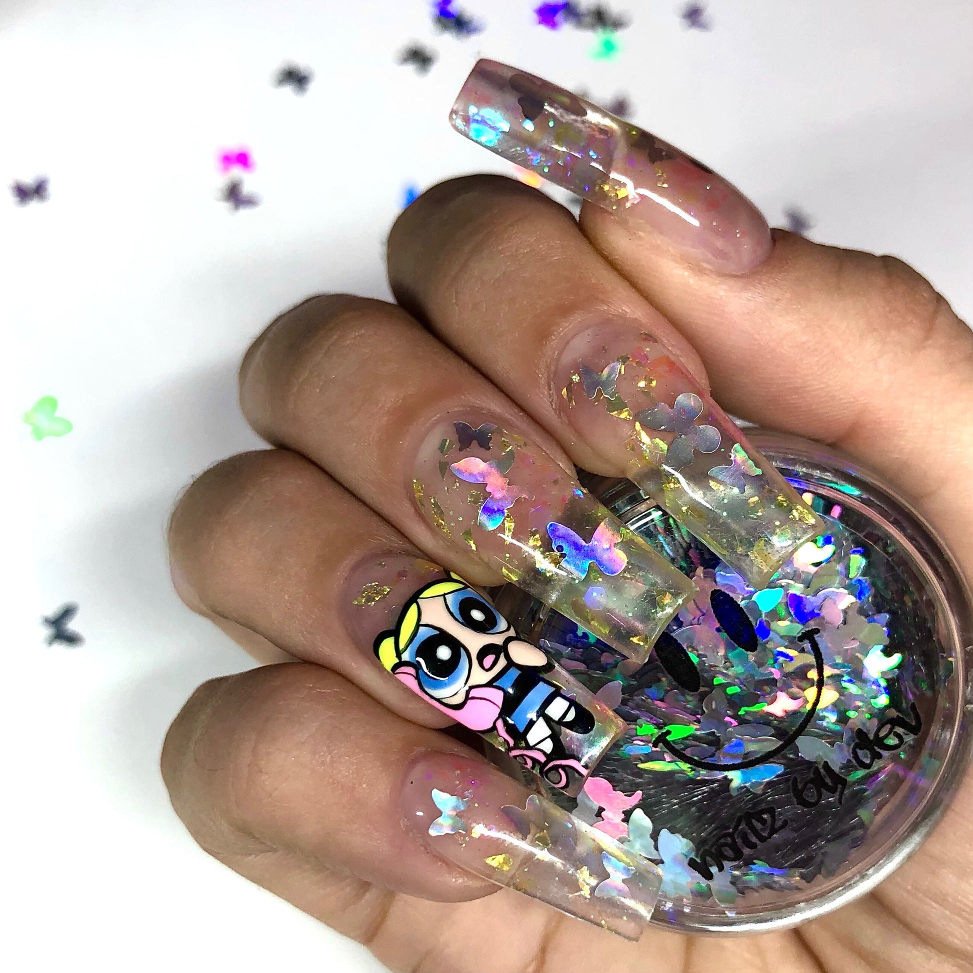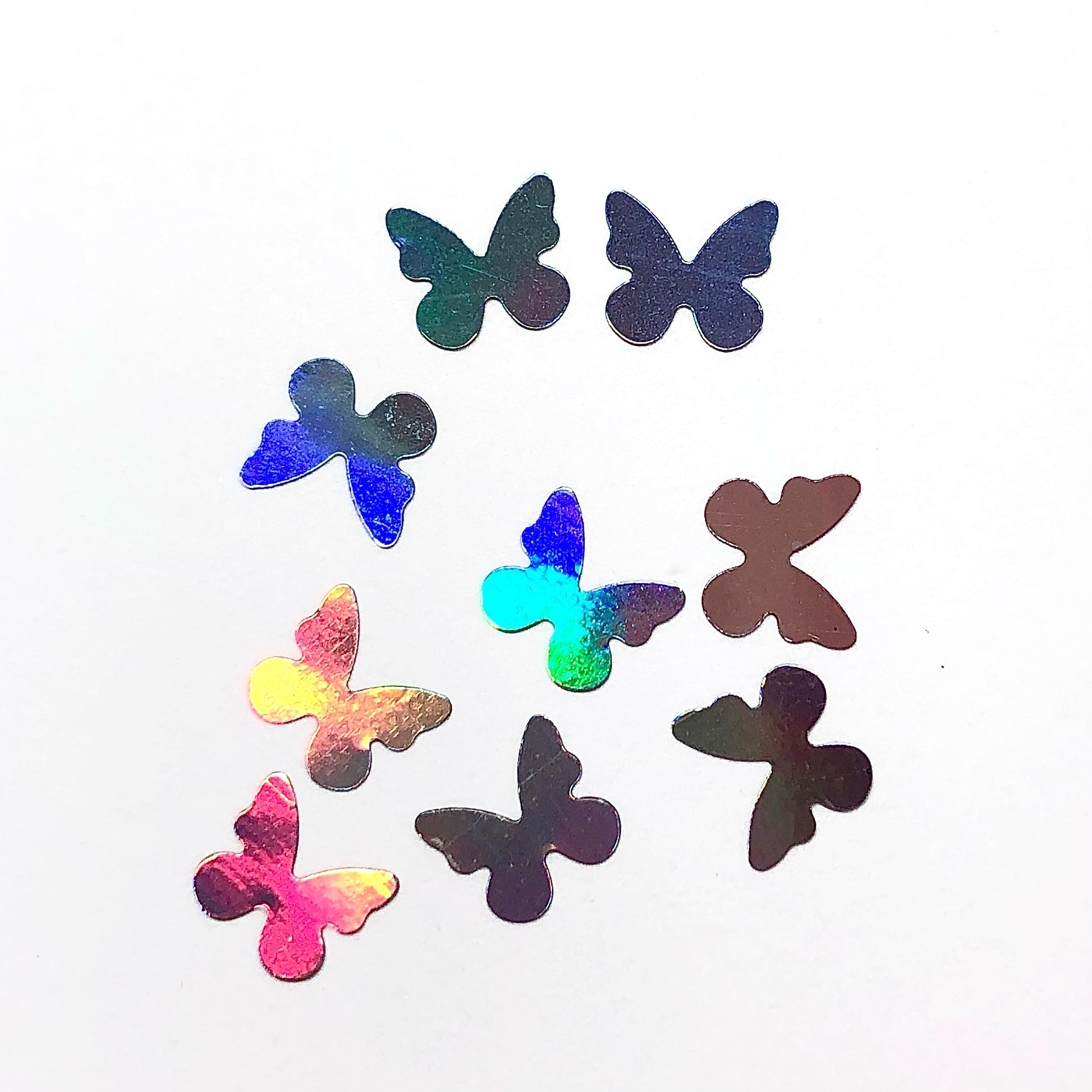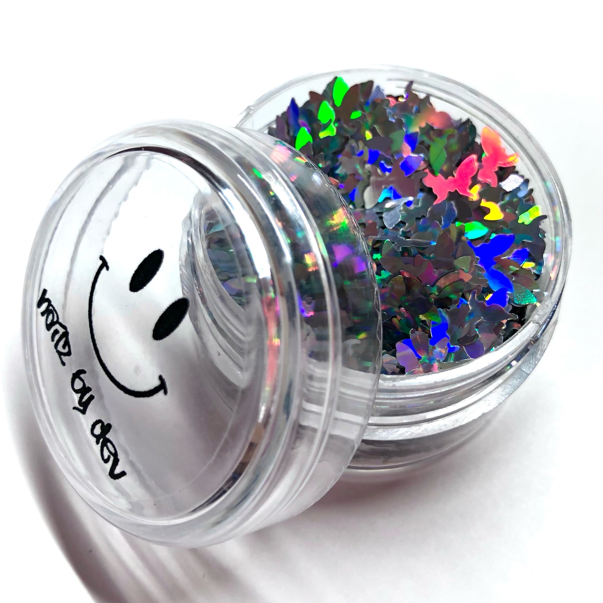 4mm holographic butterfly glitters available in Style 6 and Style 7. Comes in a large jar with 8g of product — perfect for nail art and encapsulation designs.